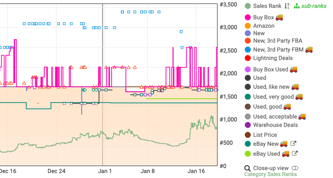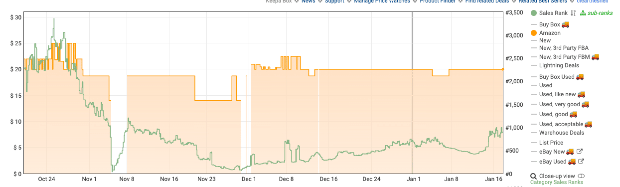 Here you can see we have just left the Sales Rank history toggled on for this Keepa chart, depicted by a green line. The decline in the sales rank number shows an increase in popularity for this product, especially around the December Christmas time period.